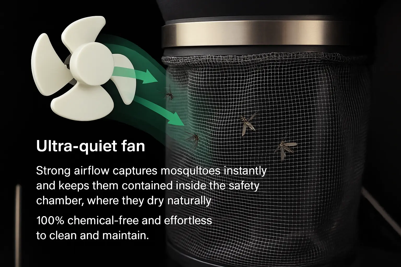 The internal trapping net ensures captured mosquitoes remain contained, allowing safe, chemical-free, and effortless cleaning.