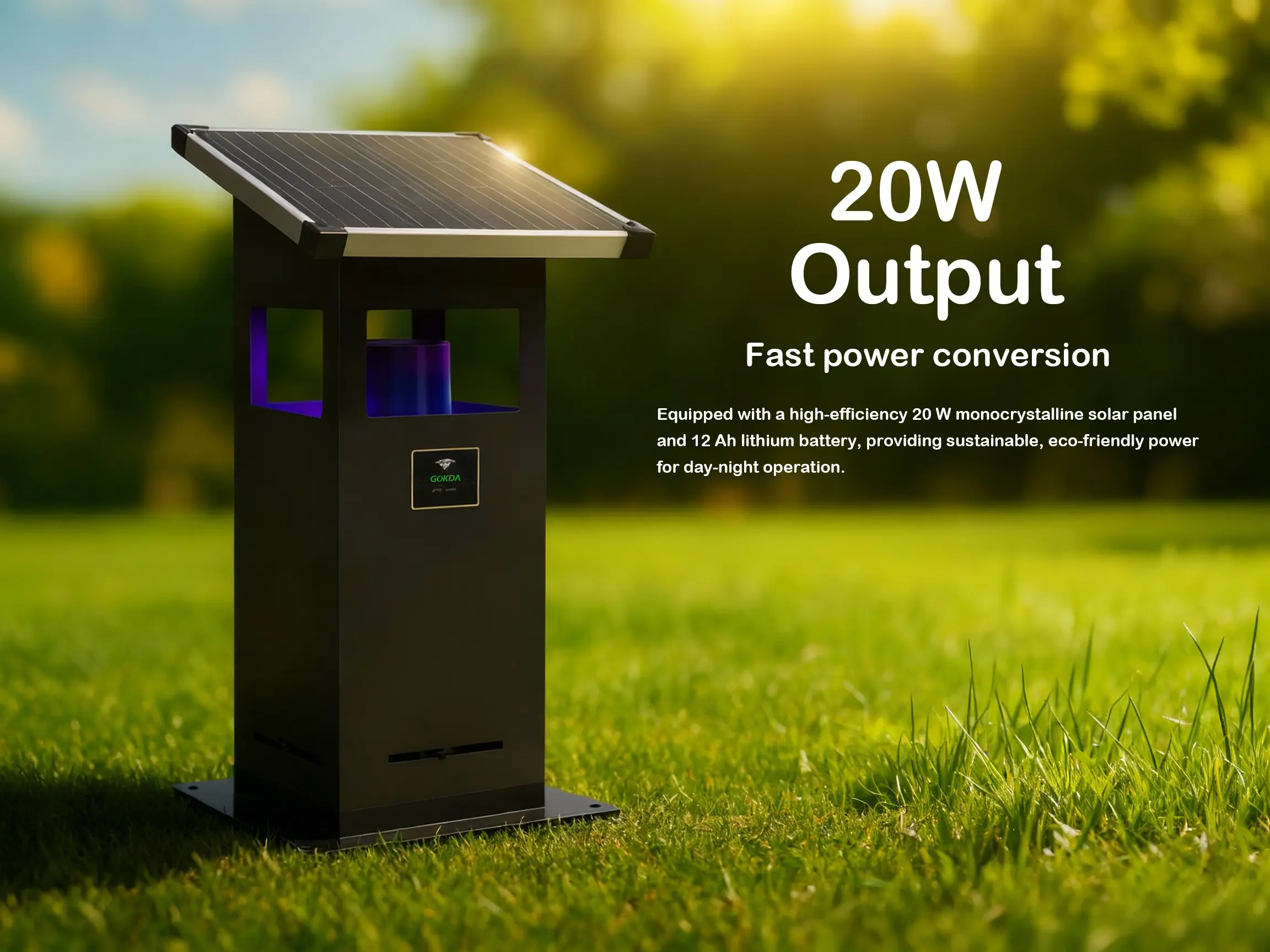 Equipped with a high-efficiency 20 W monocrystalline solar panel and 12 Ah lithium battery, providing sustainable, eco-friendly power for day-night operation without external wiring. Perfect for parks, gardens, and open landscapes.